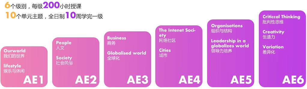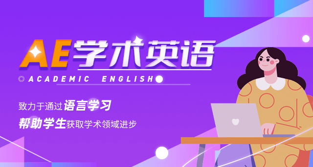 Academic English (简称AE学术英语),是海外大学语言预备课程。课程适用于世界学术场景,通过多个级别多样的主题单元探究, 纯英语的浸泡课堂,以及丰富的课余活动,全面提升学生的学术思维,英语能力,留学认知和自我管理能力。帮助学生应对英语教育环境下包括学术论文、文献阅读、全英演讲展示在内等学术挑战,完成相应等级,可顺利入读海外高等院校,实现留学成功。