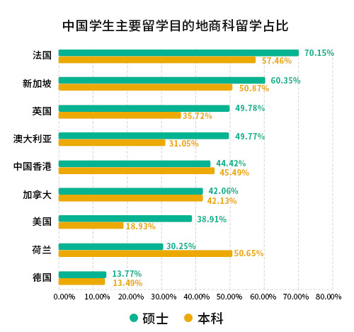 据启德留学客户服务数据显示,中国学生硕士申请主要留学目的地中,法国的商科申请占比最大,为70.15%;新加坡次之,为60.35%;英国和澳大利亚商科占比接近5成;除德国以外的其他国家,占比均超过30%。此外,中国学生本科申请主要留学目的地中,法国商科申请占比依然最高,为57%;之后依次为新加坡(50.87%)、荷兰(50.65%)、中国香港(45.49%)、加拿大(42.13%)、英国(35.72%)、澳大利亚(31.05%)、美国(18.93%)、德国(13.49%)。