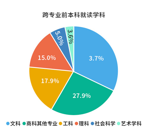 本科没有接触过实验室的学生,硕士基本上不可能读生物化学;没有绘画基础的话,也很难在研究生阶段选择动画系;文学基础薄弱的话,也很难出国修读人文研究类课程。相对这些学科,商科对于学生背景的要求更有包容性,对于跨专业申请也更宽容。《中国学生商科留学报告》调研数据显示,出国读商科硕士的学生中有 32.2% 为跨专业申请。跨专业的学生中,本科读文科的占30.7%、读商科其他专业的占27.9%。