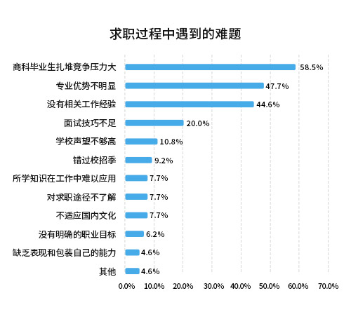 58.5%的被调研者表示商科毕业生扎堆、竞争压力大是他们求职时面对的首要问题; 47.7%的人认为自己的专业优势不明显;44.6%的商科毕业生表示没有相关工作经验是求职难的重要原因; 20 % 的人认为自己的面试技巧不足。另外,学校声望不够高、错过校招季、所学知识在工作中难以应用、对求职途径不了解、不适应国内文化、缺乏明确的职业目标、缺乏表现和包装自己的能力等都是摆在商科留学生面前的就业难题。